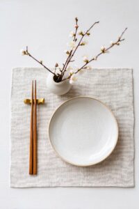 Ja – und das machen viele. Gerade weil sich Scandi und Japandi so ähnlich sind in den Grundwerten, lassen sie sich gut mischen. Ein japanisch inspiriertes, niedriges Bettgestell aus dunklem Holz mit skandinavischen Leinen-Bettwäsche in Creme und Weiß? Das funktioniert. Helle Wände wie im Scandi-Stil, aber Möbel mit japanischer Bodenähe und Keramik-Accessoires ? Sehr schön sogar.